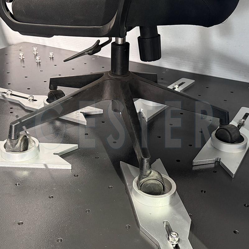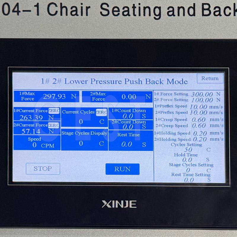 La máquina de pruebas de asientos y respaldos de sillas está equipada con dos unidades de accionamiento y puede controlarse individualmente para cargar repetidamente los puntos de prueba del asiento. Mediante diferentes ajustes de parámetros, la máquina puede realizar las siguientes pruebas en el asiento: