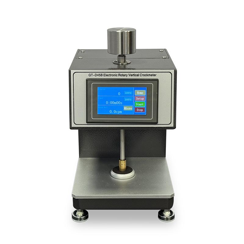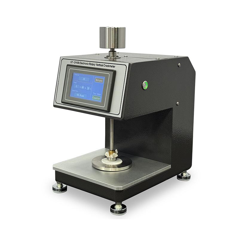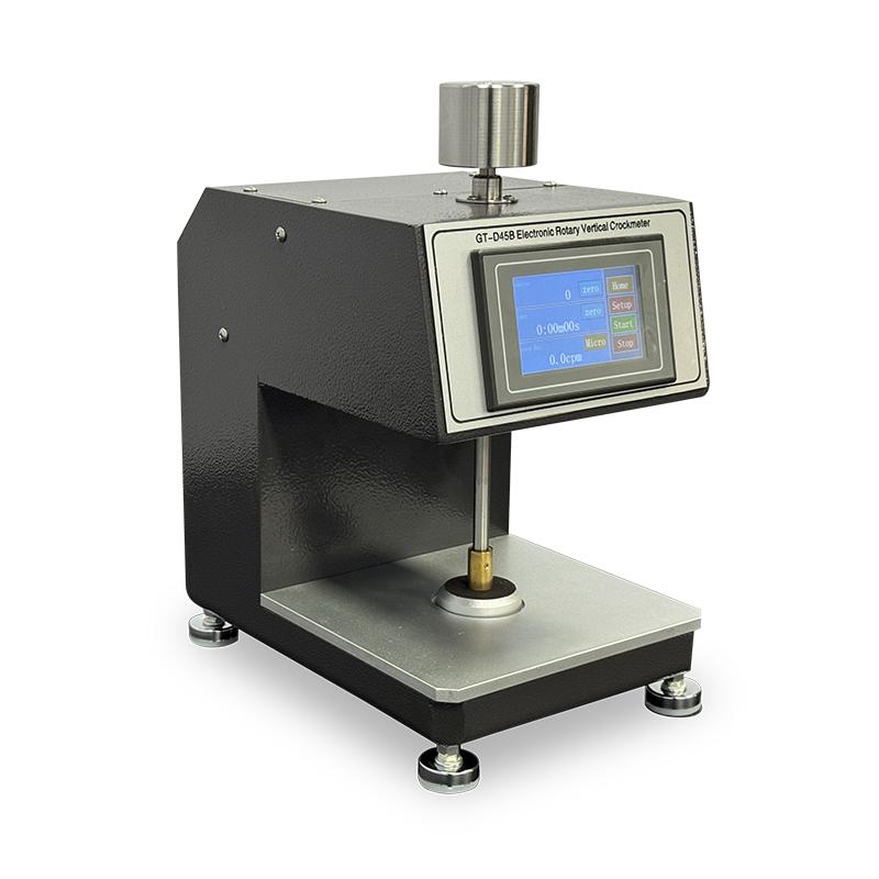 , para determinar la solidez del color de los textiles al roce en seco o húmedo, especialmente para telas de impresión. El crockmeter rotatorio aplica 1134 gramos de presión sobre un dedo de 16 mm y gira 1,125 vueltas en el sentido de las agujas del reloj y luego en sentido contrario