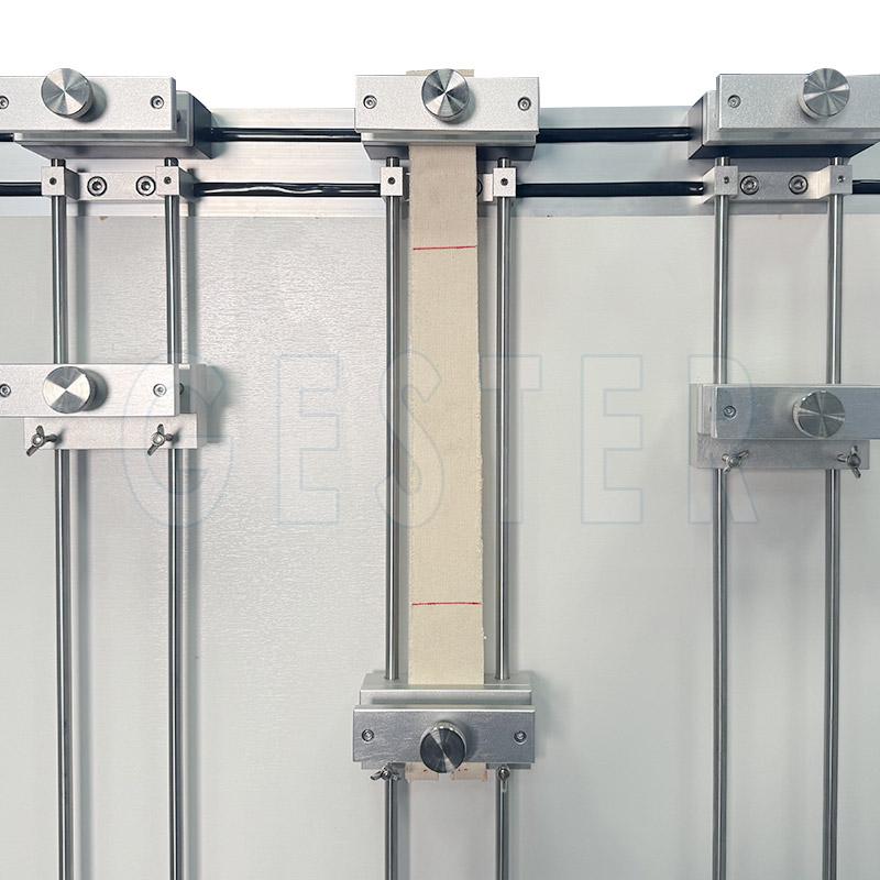 1.Método de carga fija: Sujete la muestra en la abrazadera superior, cuelgue los pesos especificados debajo de ella, después de 4 ciclos de carga, luego pruebe su rendimiento de estiramiento, crecimiento y recuperación.